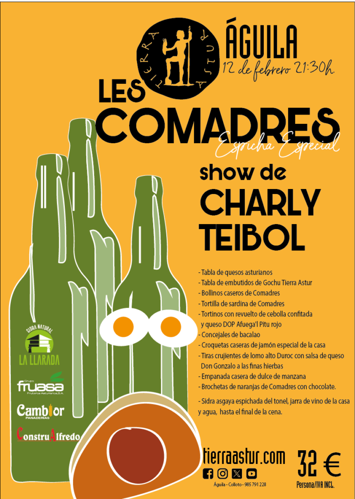 El 12 de Febrero, ven a Tierra Astur Águila, en Colloto, a festejar las comadres con el show de Charly Teibol. 👨🍳 Menú: Tabla